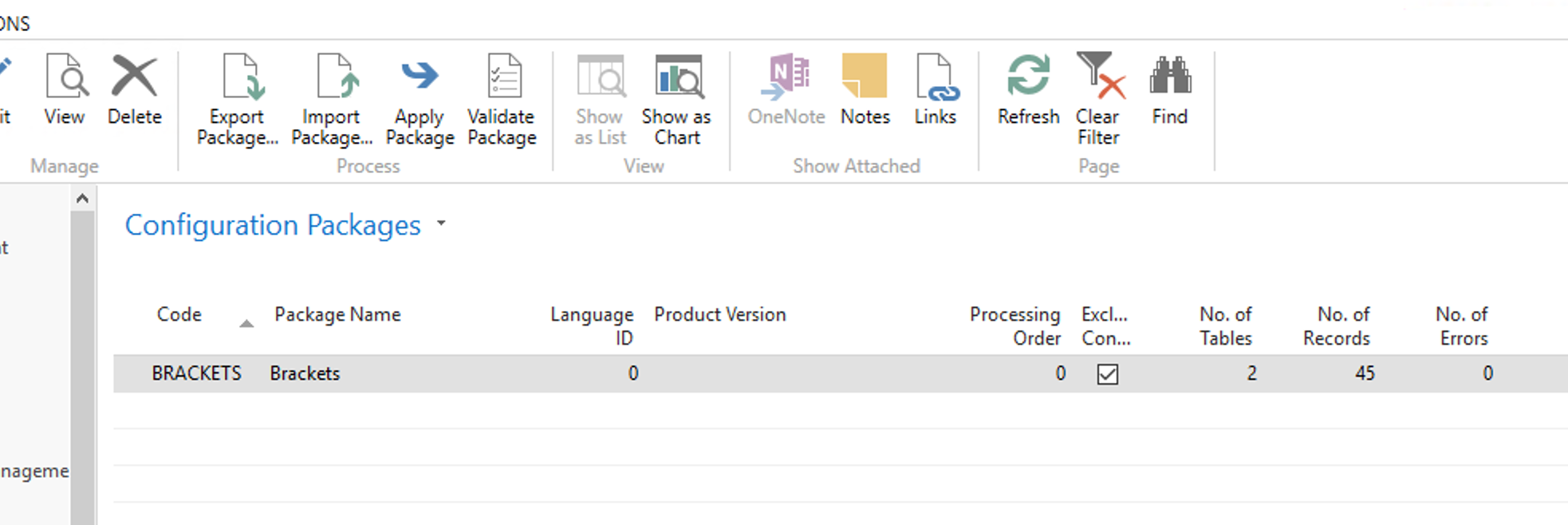 - Select the configuration package called Brackets and verify that it contains 45 records. If that's the case click Apply Package and then Yes.