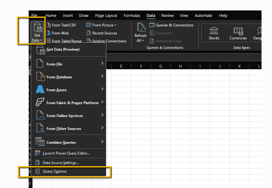 - Click on Get Data → Query Options
